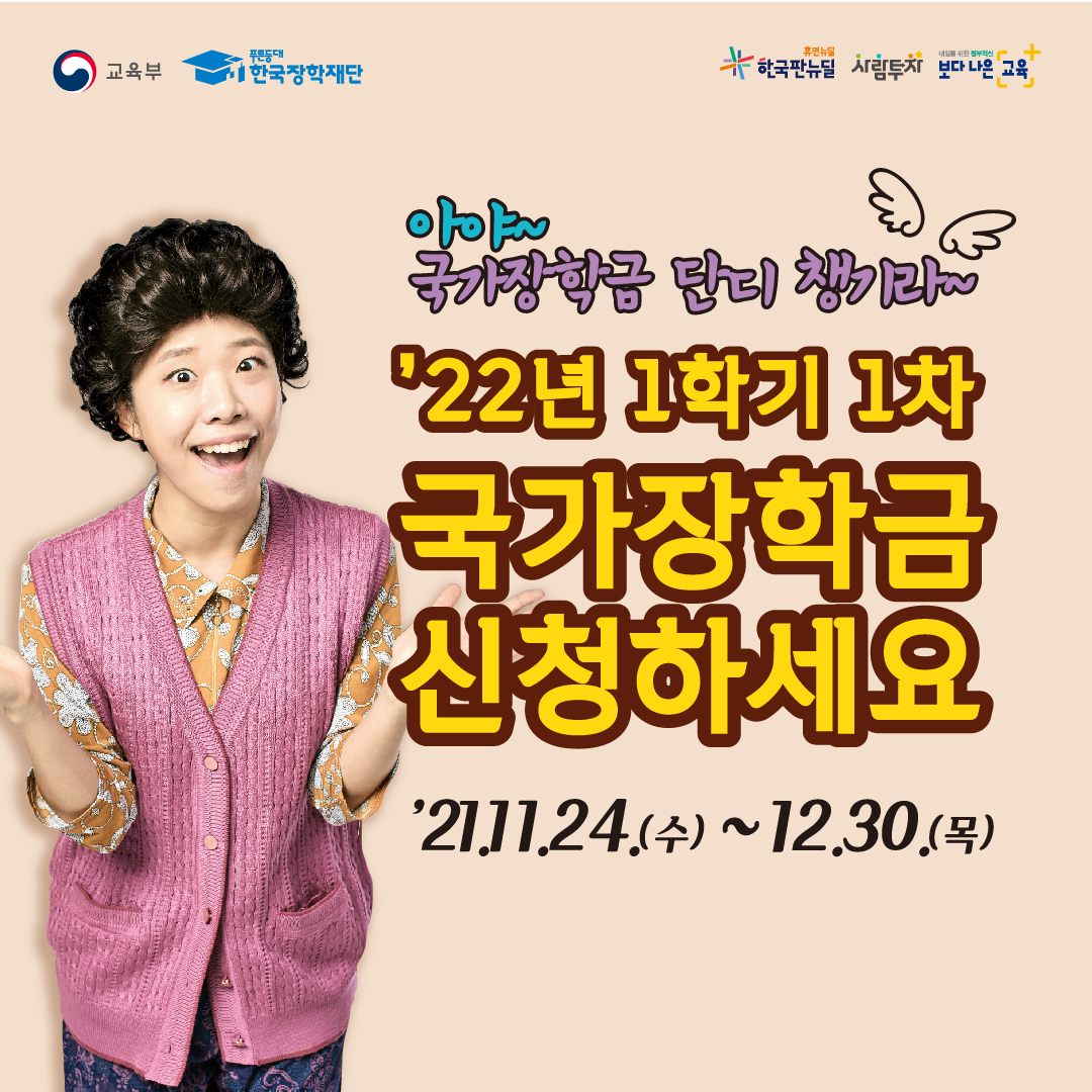 2022학년도 1학기 1차 국가장학금 신청 관련 사항을 아래와 같이 안내하오니, 기한 내에 신청해주시기 바랍니다. ㅇ (신청기간) 2021.11.24.(수) 9시 ~ 2021.12.30.(목) 18시(총 37일간) ㅇ (서류 제출 및 가구원 동의) 2021.11.24.(수) ~ 2022.1. 4.(화)18시 ㅇ (신청대상) 재학생,신입생(고3,재수생 등 입학예정자),편입생,재입학생,복학생 등 모든 대학생 ※ 재학생은 등록금 고지서 상 우선감면을 위해 1차 신청이 원칙이며, 2차 신청자는 재학 중 2회에 한하여 구제신청 자동 적용 및 심사 후 지원 가능 (구제신청 적용 여부 선택 불가) ※ 국가근로장학금 신청 희망자는 국가장학금 신청시, 국가근로장학금 항목 체크하여 동시 신청(일반공지 1736번 게시글 참고) ※ 신청 전 준비사항 : 본인 명의 전자서명수단[공동인증서 또는 금융인증서, 민간인증서(카카오톡, 이동통신PASS, KB국민은행, PAYCO, 삼성PASS)] 준비 및 계좌번호 확인, 부모님의 주민번호 확인 및 전자서명수단(기혼자는 배우자의 주민번호 및 전자서명수단) 준비 ※ 국가장학금 신청 및 서류확인(서류제출은 대상자에 한함), 가구원 동의 모두가 반드시 완료되어야 2022년 1학기 국가장학금 수혜가 가능합니다.