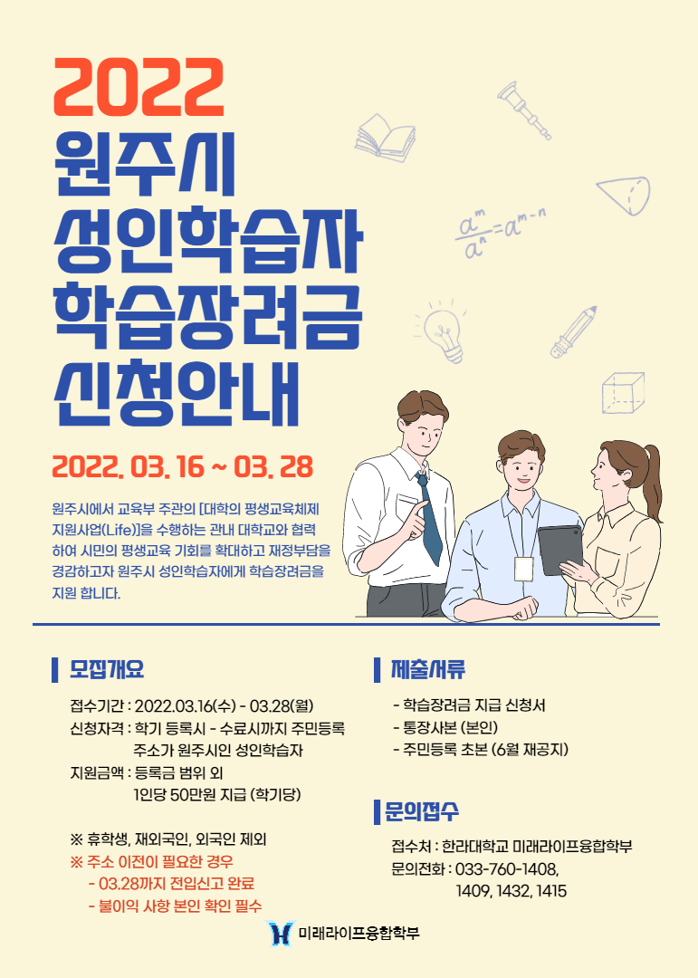 ▶ 지급금액 : 1인당 50만원 지급(학기당 / 등록금 범위 외) ▶ 신청기간 : 2022. 03. 16 - 03. 28 ▶ 신청장소 : 한라대학교 미래라이프융합학부 ▶ 제출서류 : 학습장려금 지급 신청서, 통장사본(본인), 주민등록 초본(6월 재공지) ▶ 문의전화 : 033)760-1408, 1432, 1415, 1409 |