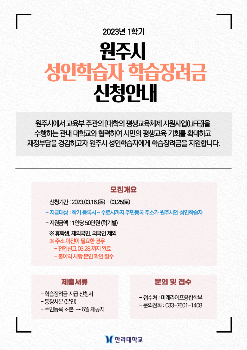 원주시에서 교육부 주관의 [대학의 평생교육체제지원사업(LiFE 사업)]을 수행하는 관내 대학교와 협력하여 시민의 평생교육 기회를 확대하고 재정부담을 경감하고자 원주시 성인학습자에게 학습장려금을 지원합니다. 아래와 같이 매학기 등록시부터 수료시까지 주민등록상 주소가 원주시인 원주시민에 한하여 학습장려금을 지급하오니 대상에 해당되는 성인학습자는 아래의 사항을 확인하시어 신청하여 주시기 바랍니다. ▶ 지급대상 : 학기 등록시 - 수료시까지 주민등록 주소가 원주시인 성인학습자 ※ 휴학생, 재외국민, 외국인 제외 ※ 주소 이전이 필요한 경우 - 1) 전입신고 03.28까지 완료 및 2) 불이익 사항 본인 확인 필수