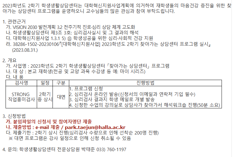 학생생활상담센터에서 STRONG 직업흥미검사를 실시합니다. 내가 어떤 직업에 맞는 성향인지를 파악할 수 있는 좋은 검사입니다. 검사를 원하는 학생들은 9월8일(금)까지 조교선생님께 신청하시기 바랍니다.