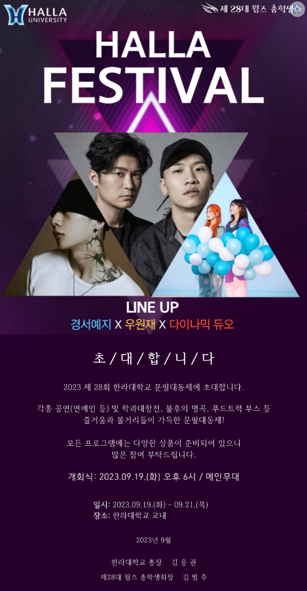 | 첨부파일 | 축제.png 2023학년도 문필대동제 일정표(Time Table).pdf | ||