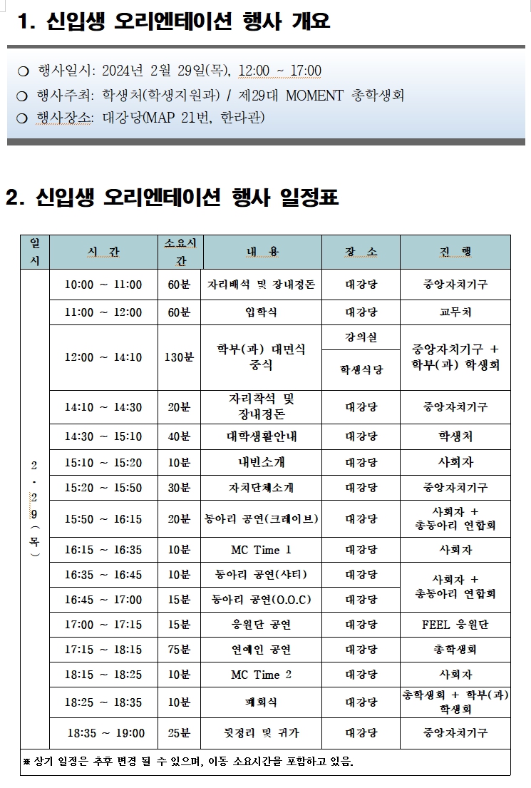 [신입생] 입학식 후 오리엔테이션 일정
