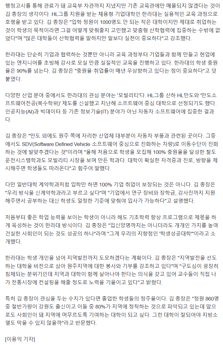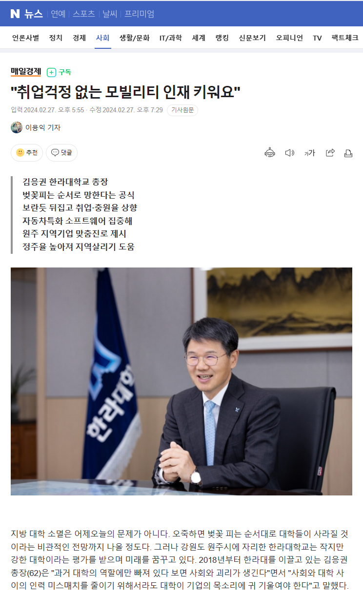 취업 걱정없는 모빌리티 인재 키워요(총장님 메일경제 인터뷰)