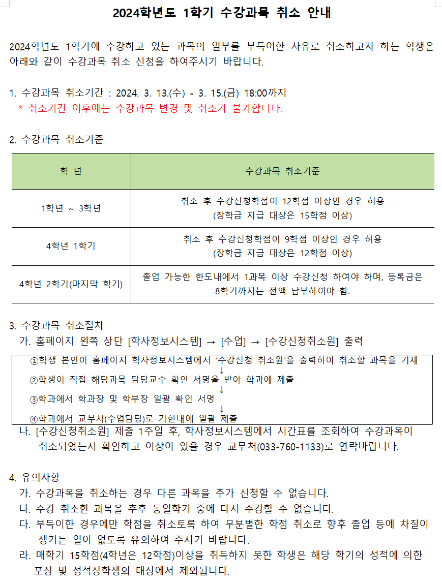 1학기 수강과목 취소안내