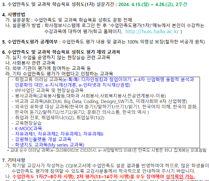 1학기 수업만족도 및 교과목 학습목표 성취도 평가(1차) 안내