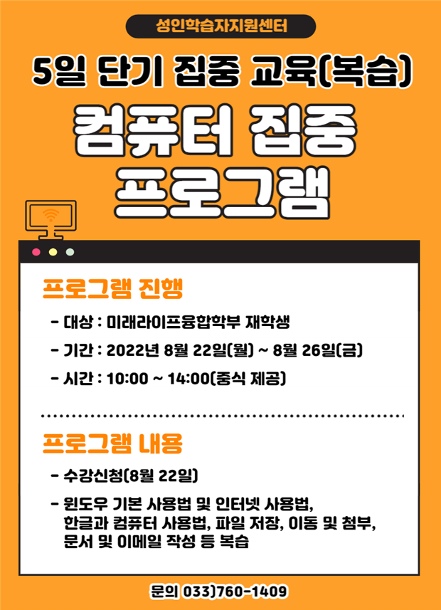 1. 프로그램명 : 컴퓨터 집중프로그램(복습) 2. 대상 : 미래라이프융합학부 재학생 3. 기간 : 2022.08.22(월) ~ 2022.08.26(금) 4. 시간 : 10:00 ~ 14:00 (중식제공) 5. 프로그램 내용 - 수강신청(08월 22일) - 윈도우 기본 사용법 및 인터넷 사용법 - 한글과 컴퓨터 사용법 - 파일 저장 - 파일 이동 및 첨부 - 문서 및 이메일 작성 등 복습 |