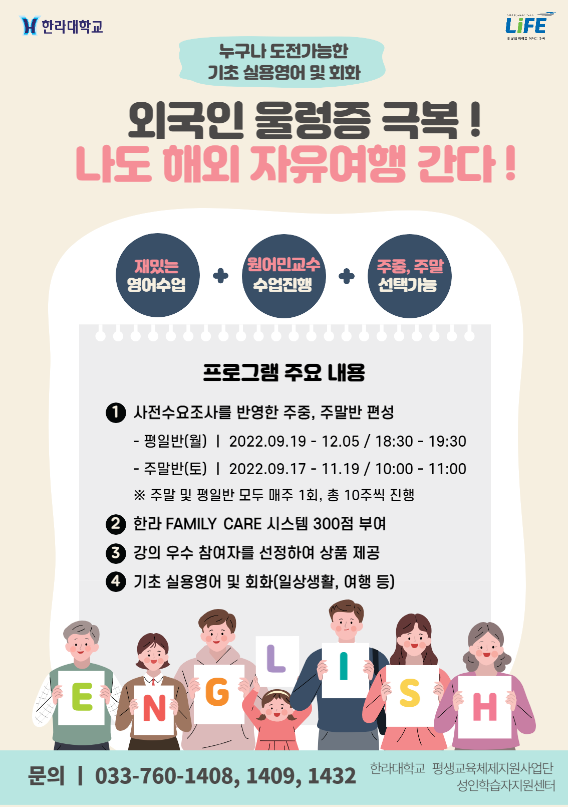 성인학습자지원센터 비교과프로그램 [기초실용영어 및 회화] 1. 시간 및 기간 - 평일반(매주 월) 09.19~12.05 / 18:30~19:30 - 주말반(매주 토) 09.17~11.19 / 10:00~11:00 2. 원어민 교수가 수업 진행(일상생활, 여행 등 기초 실용영어 및 회화) 3. 한라 FAMILY CARE 시스템 300점 부여 누구나 도전 가능한 기초 실용영어 및 회화 비교과 프로그램을 진행합니다. 많은 참여 부탁드립니다.