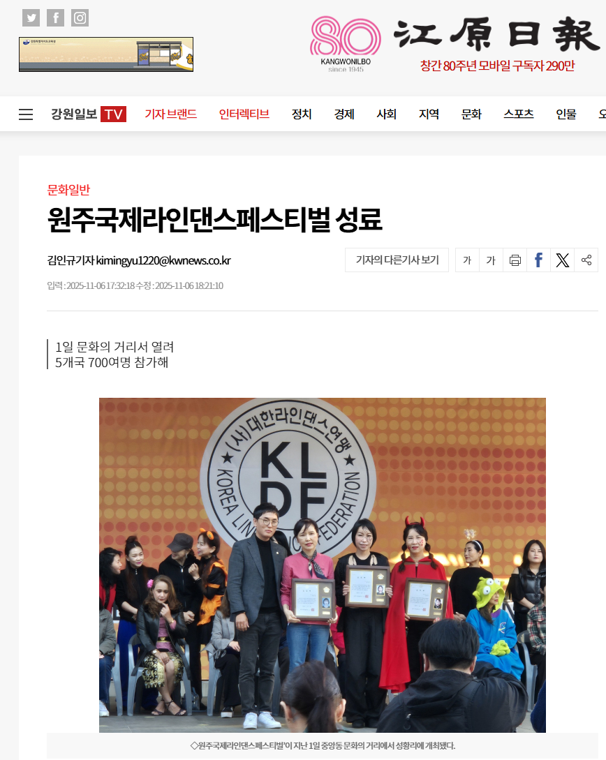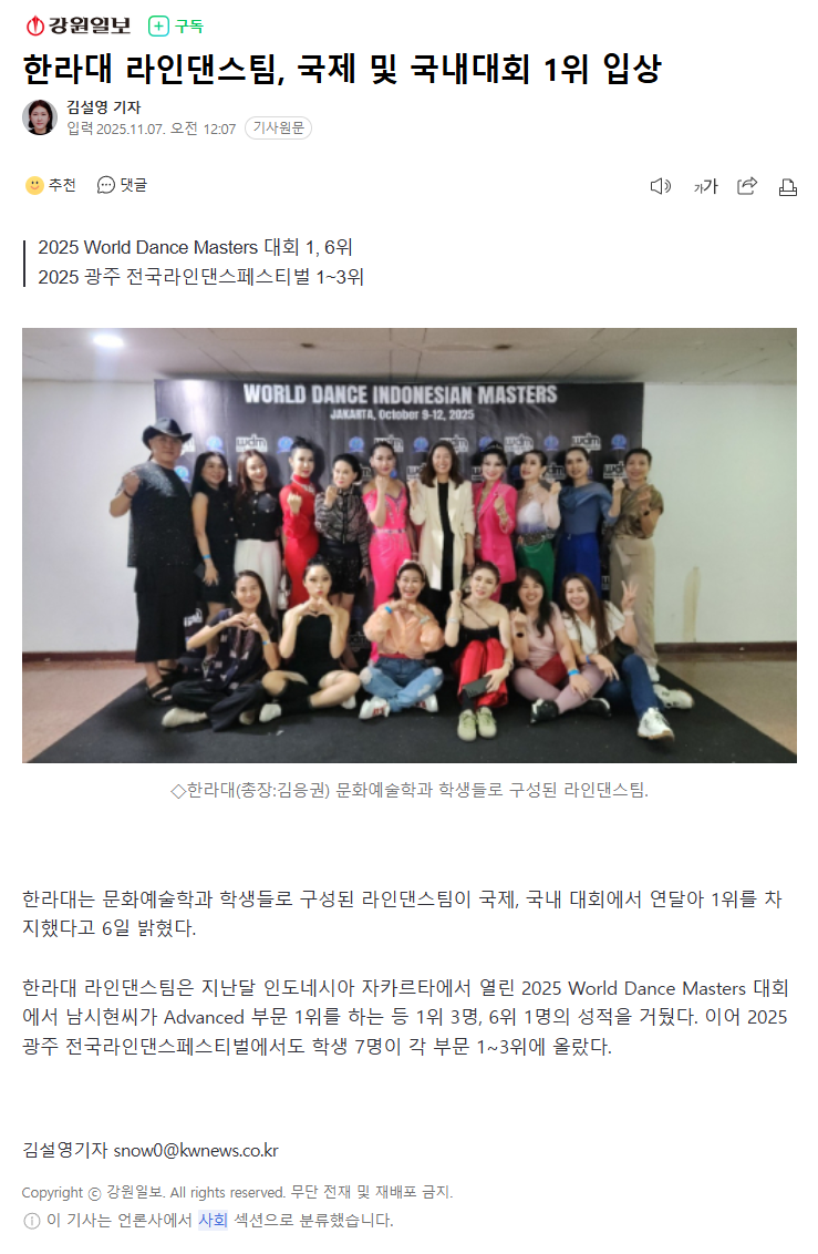 한라대 라인댄스팀, 국제 및 국내대회 1위 입상(강원일보)